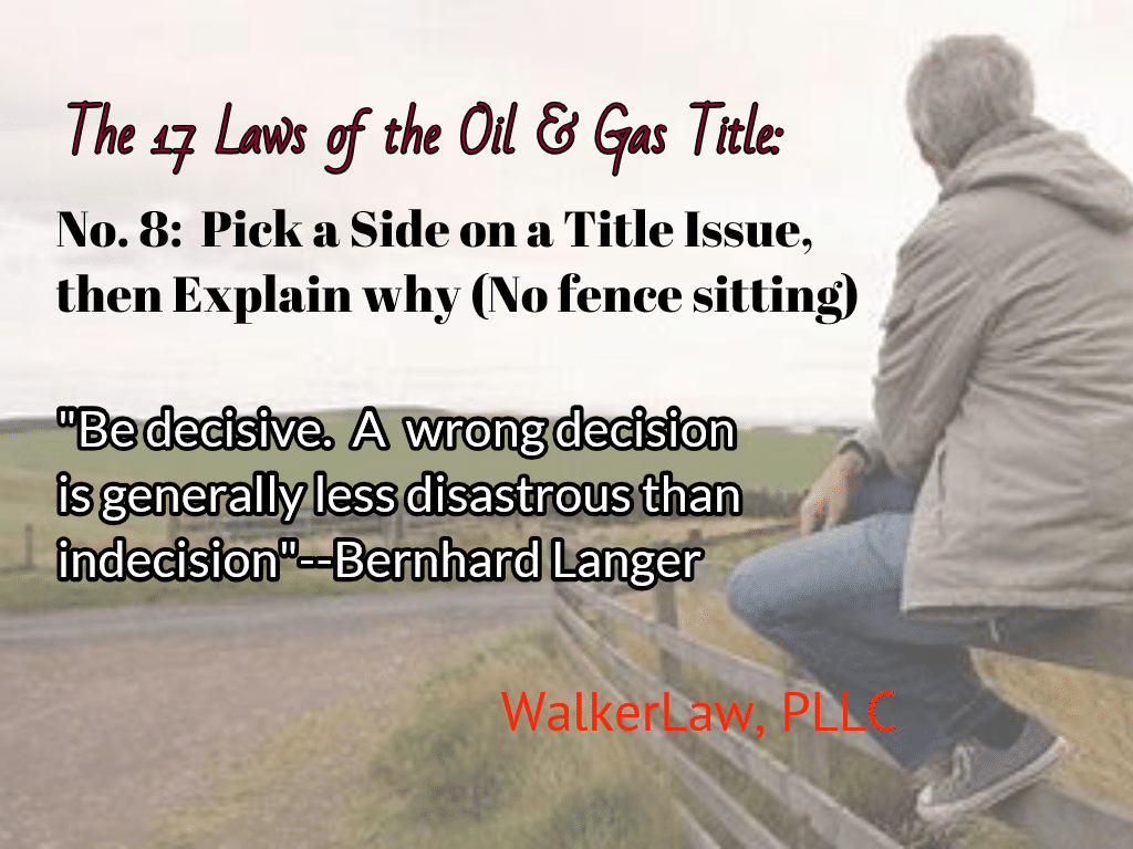 For Title Law No. 8—you should generally take the side that is easiest to defend when writing title Objections (even though that may not be the side you think ultimately wins the day given additional title evidence).